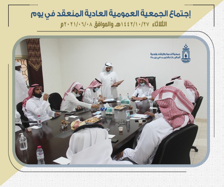 الجمعية العمومية لجمعية الدعوة والإرشاد وتوعية الجاليات بالخبيب ببريدة عقدت اجتماعها الاعتيادي لعام 2021م بمقر الجمعية، وفي بداية الاجتماع رحب الأستاذ /سليمان بن عطا الله دخيل الدخيل نائب رئيس مجلس الإدارة بأعضاء الجمعية وبممثل وزارة الموارد البشرية الاستاذ ياسر مرزوق الحيسوني الذين استجابوا لدعوة عقد الجمعية العمومية، ونوه على الدور الفاعل للأعضاء فيما يخدم مصلحة الجمعية ويرتقي بنوعية البرامج والأنشطة التي تنفذ، ودورهم الفاعل في تعزيز الموارد المالية المستدامة.