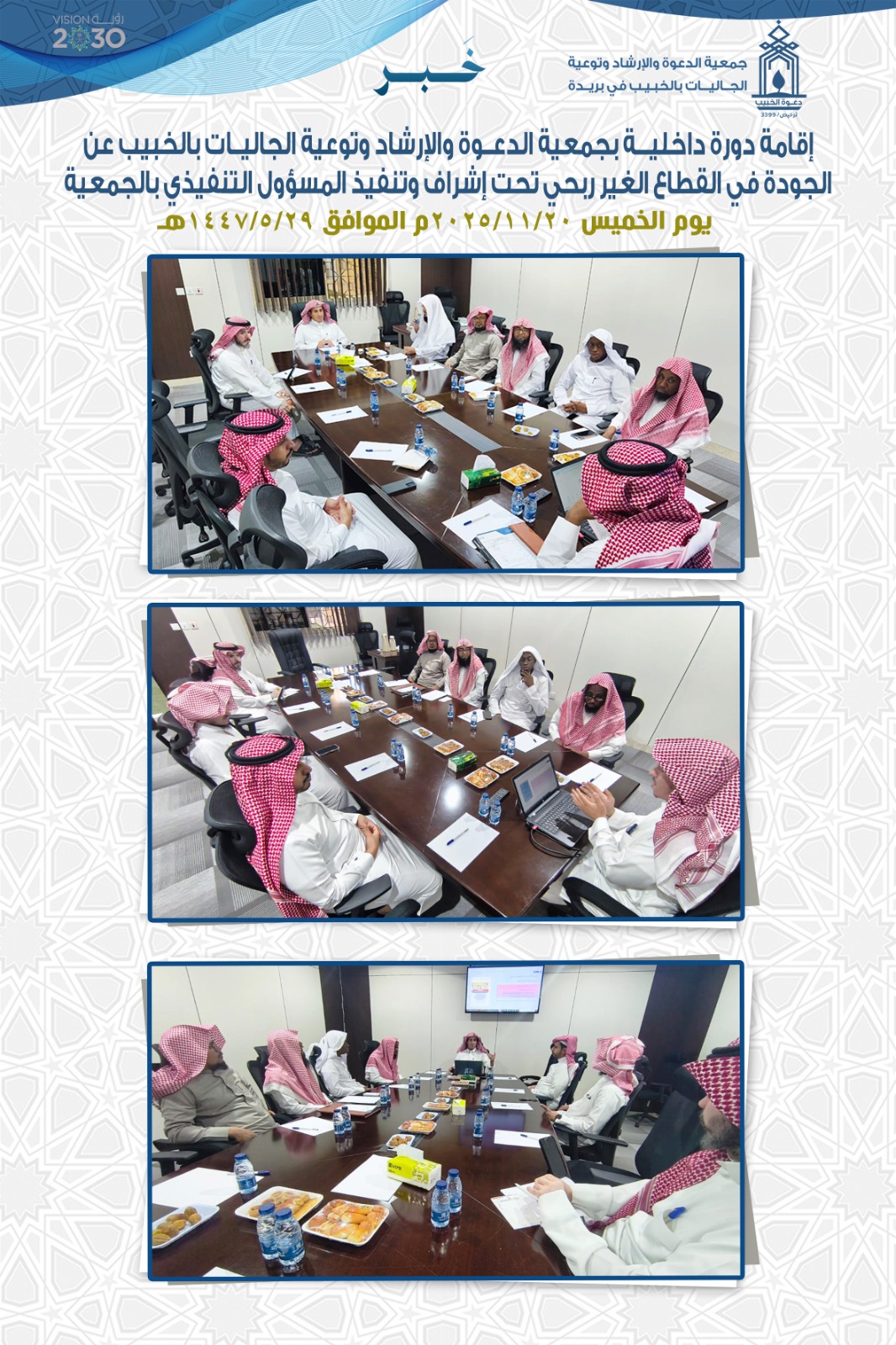 أقامت الجمعية دورة تدريبية عن تطبيق نظام الجودة في القطاع غير الربحي وذلك تحت إشراف وتنفيذ الأستاذ/ إبراهيم بن عبدالعزيز الدبيان المسؤول التنفيذي بالجمعية يوم الخميس 2025/11/20م الموافق 1447/05/29هـ