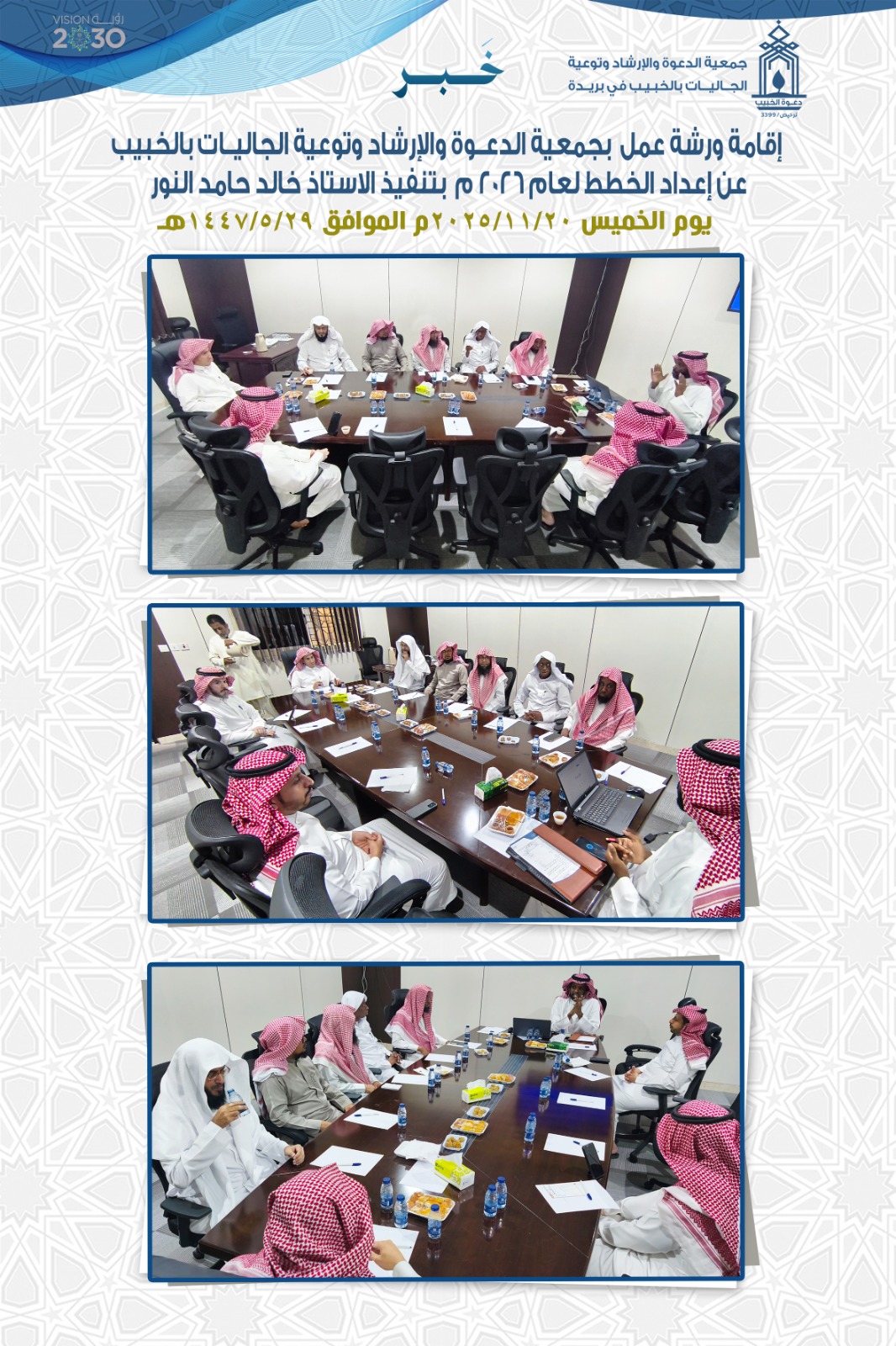 أقامت الجمعية ورشة عمل لمنسوبي الجمعية ورؤساء الأقسام عن إعداد الخطط التشغيلية لعام 2026م بتنفيذ الأستاذ/ خالد الكرداوي يوم الخميس 2025/11/20م الموافق 1447/05/29هـ