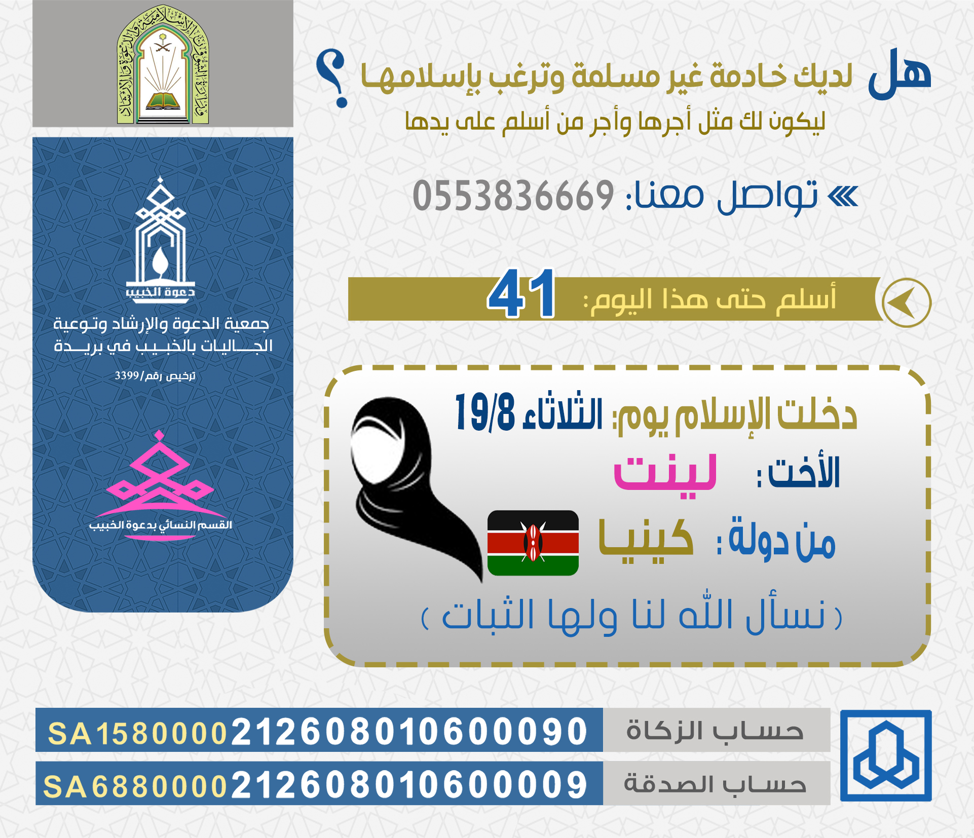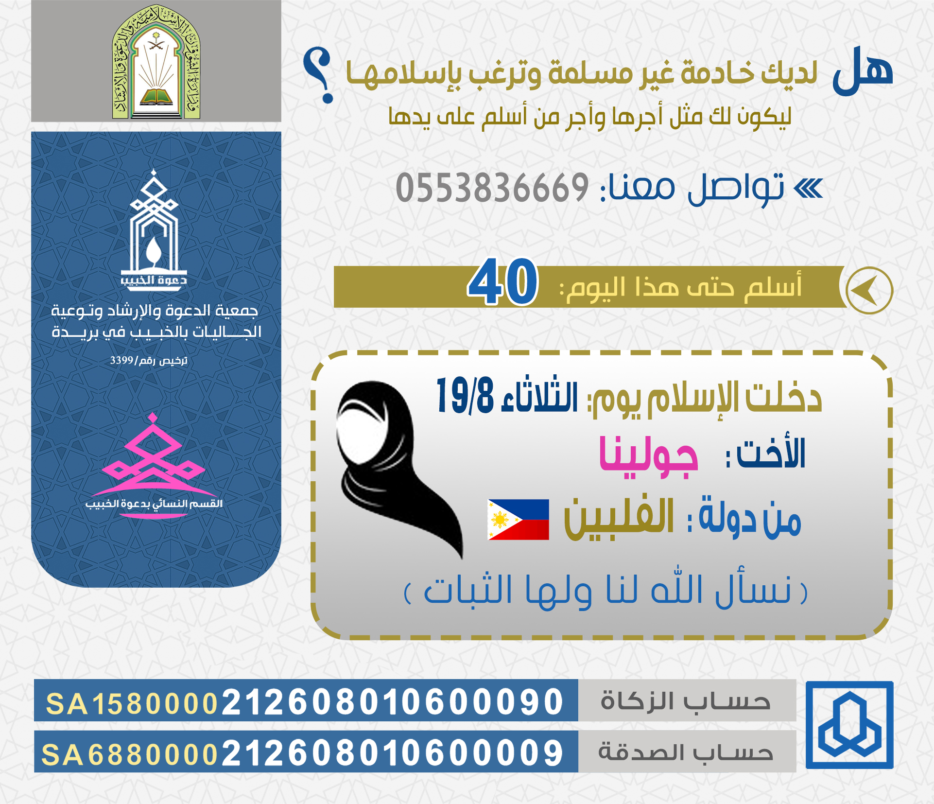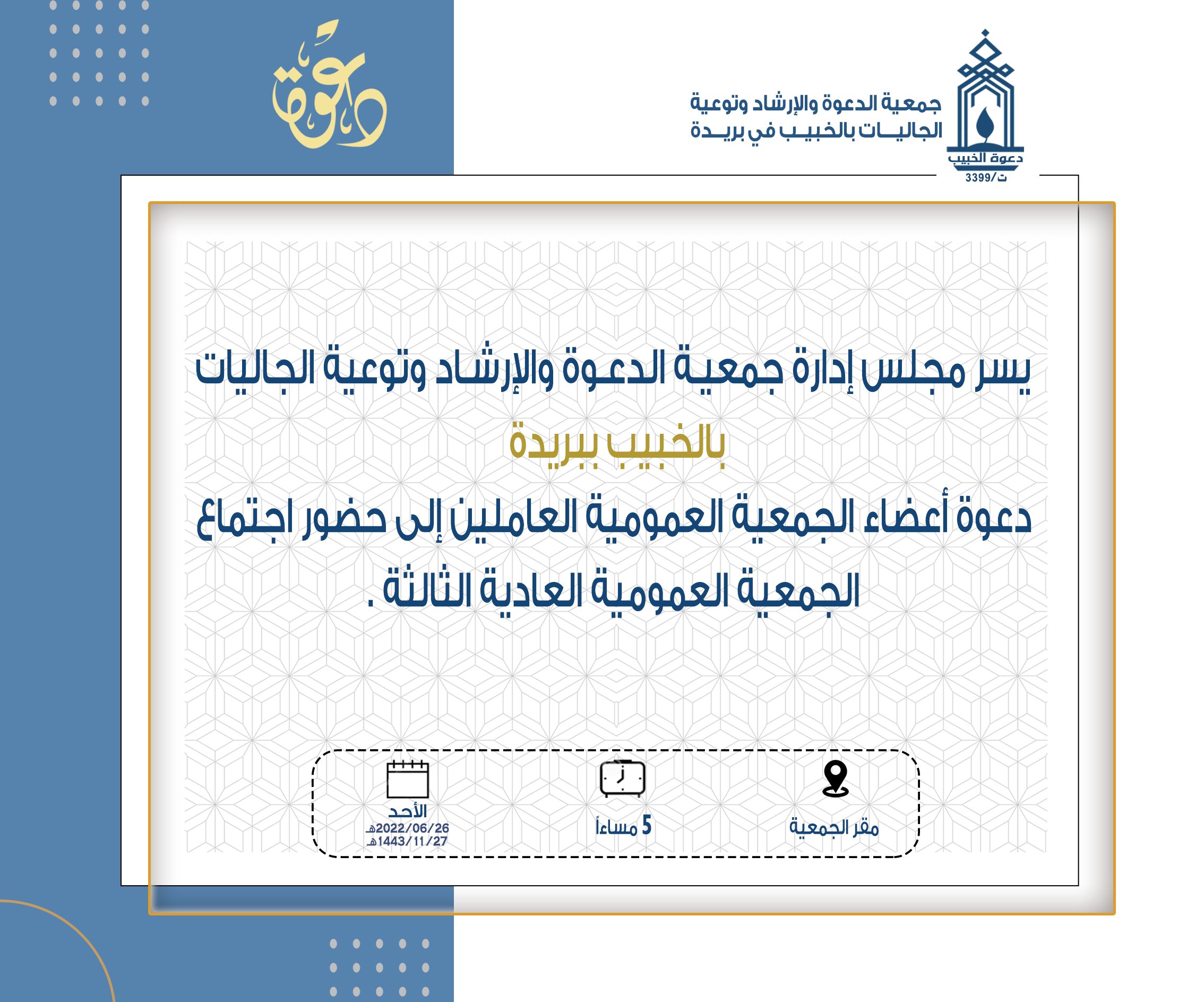يقدم أعضاء مجلس الإدارة وأعضاء الجمعية العمومية لجمعية الدعوة والإرشاد وتوعية الجاليات بالخبيب ببريدة، والإدارة التنفيذية، وجميع منسوبي الجمعية ، بأصدق التهاني والتبريكات لسعادة رئيس مجلس إدارة الجمعية فضيلة الشيخ الدكتور / عطاالله بن دخيل الدخيل بمناسبة حصوله على درجة…